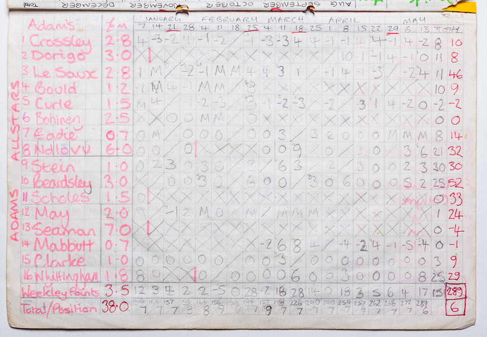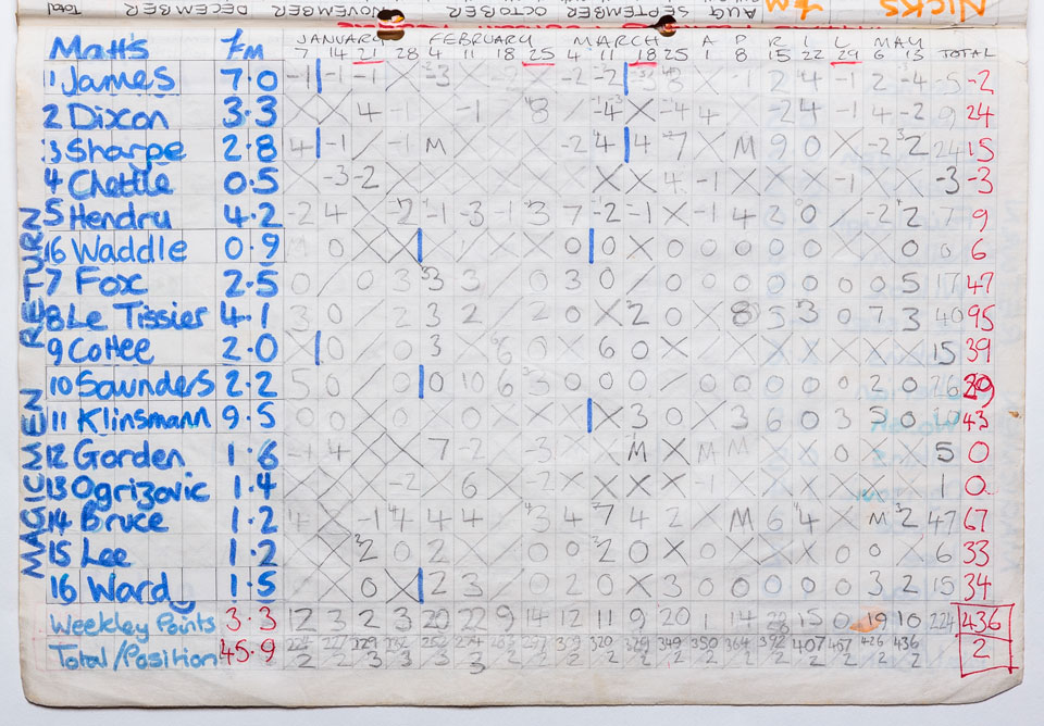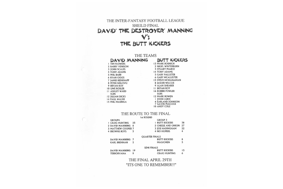Four of the current managers remained from the previous season, and they were joined by five new additions, taking the league up to nine teams. Four of the five were Ross Peggs, Adam Pritchard, Stuart Wigby and David Hadingham. The fifth, and the eventual 1994/95 champion was Lawrence Baynes, who again if memory serves me correct, only joined the league hours before the pre-planned auction. The video also shows excited onlookers, and future sfp managers Paul Cooper and Craig Hunting, plus Ben Sprake. Nick has also just been stung by a wasp on the cheek.