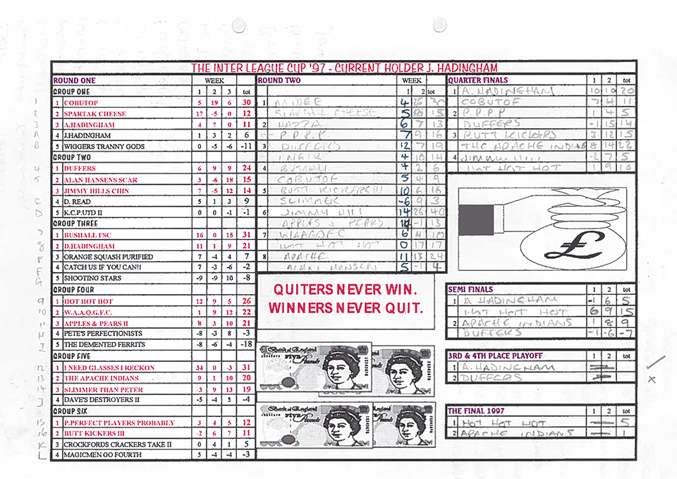 In the Inter League Cup, Aaron Fenns's Hot Hot Hot represented the SFP in the final against St James Fantasy League opposition. Unbelieveably Fenn took his first honour in his debut season, against much favoured Tom Rycroft's Apache Indians with a 5:1 win.