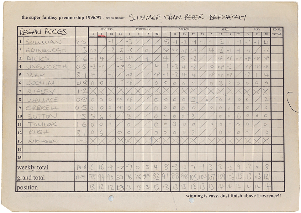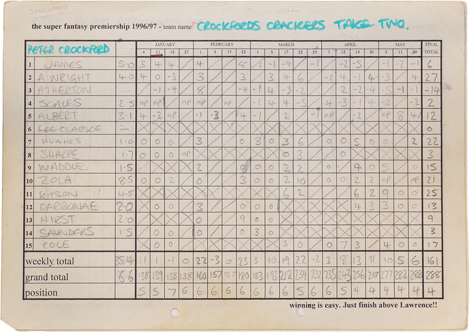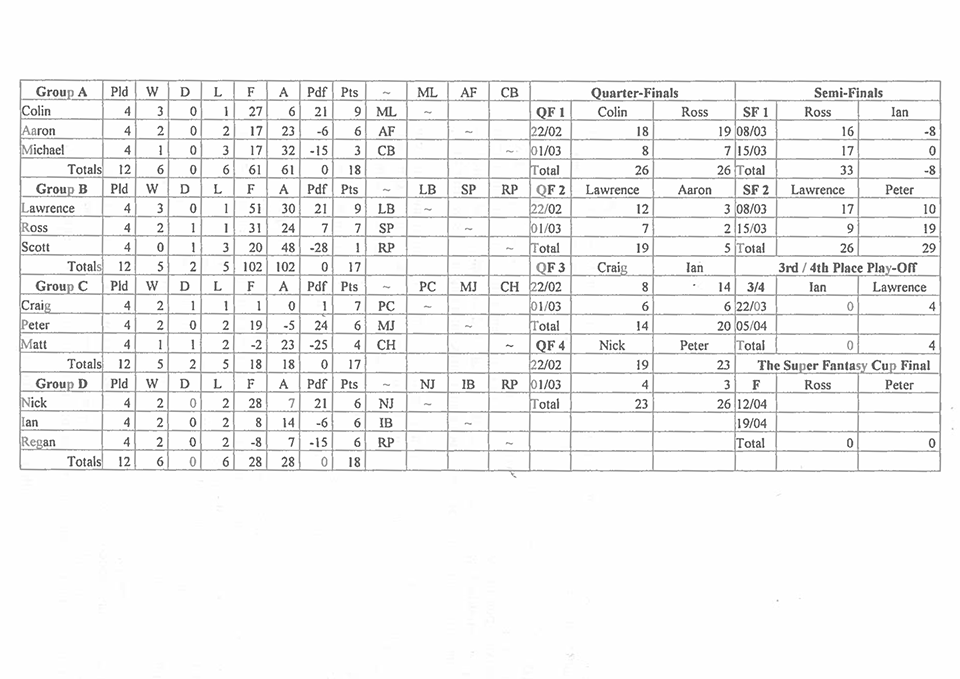 In 1996 the league grew yet again with the addition of another 3 managers. Scott Pritchard, Aaron Fenn and Craig Hunting joined the previous season's twelve managers for auction four, hosted in the the Jermy Garden in St James.
