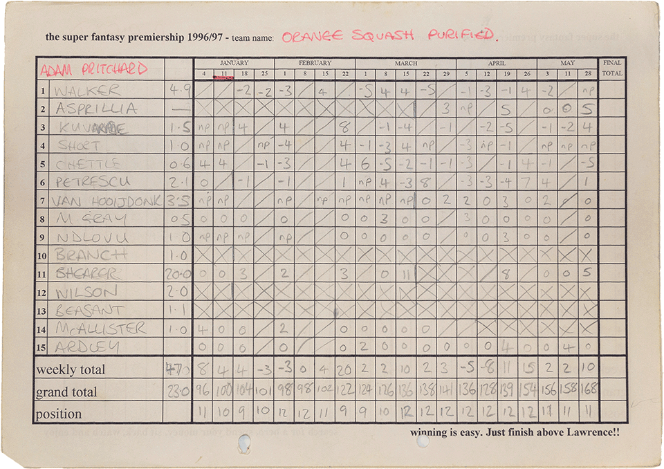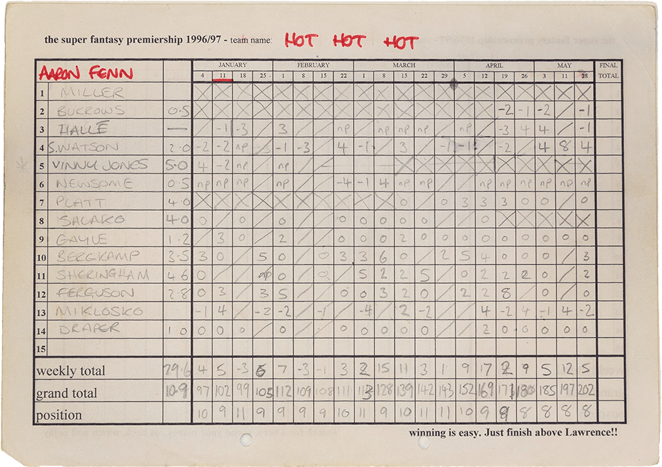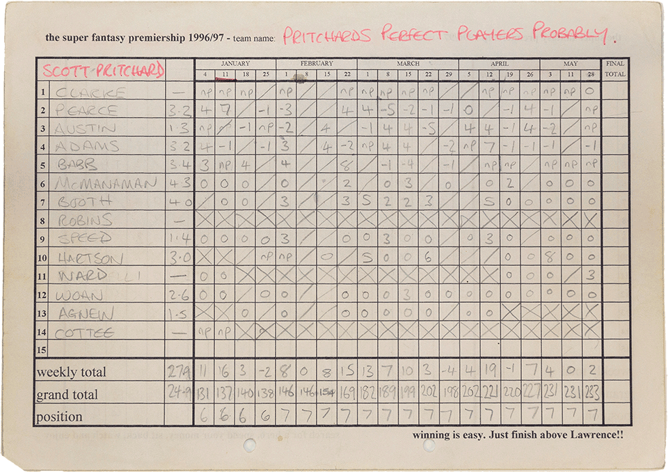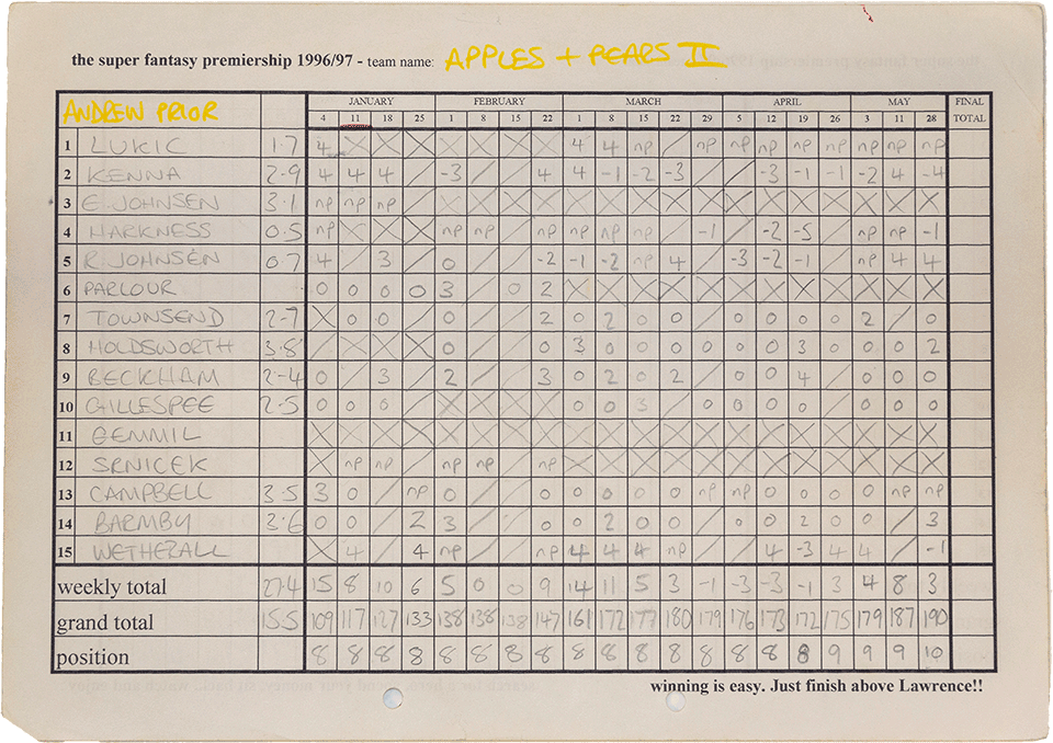 In 1996 the league grew yet again with the addition of another 3 managers. Scott Pritchard, Aaron Fenn and Craig Hunting joined the previous season's twelve managers for auction four, hosted in the the Jermy Garden in St James.