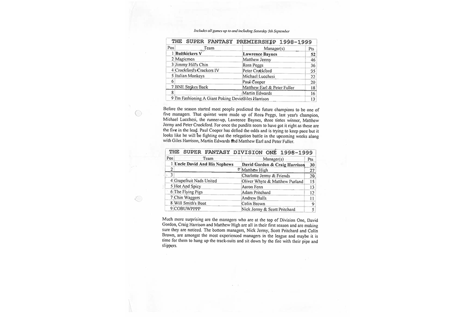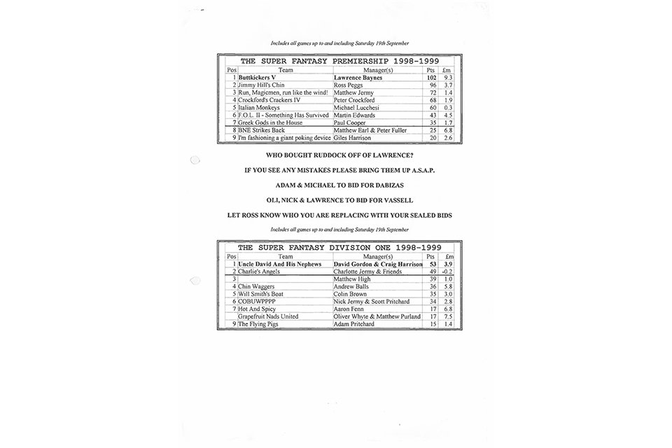 With Matthew away at University, Ross took over the reigns for the season. Unfortunatly, all records have been lost for this season, but we do know that MAGICMEN were the eventual winners. The following seasons auction booklet also suggests they won the SFP Cup to complete the double, and that Lawrence Baynes finished runner up in the league. Everybody else is listed in alphabetical order in the leagues they began the season in.