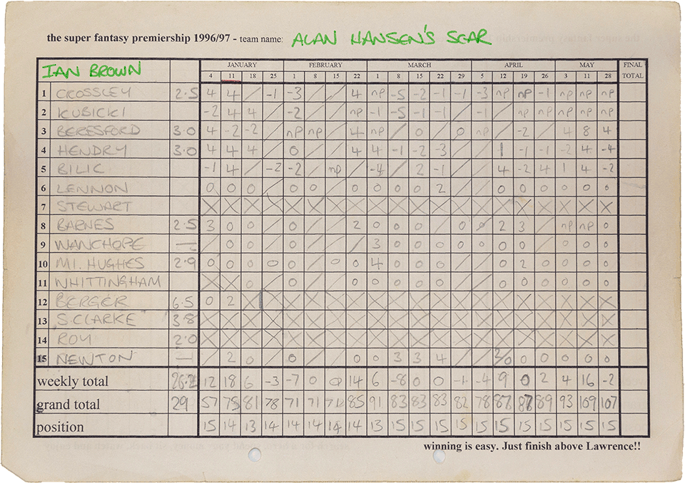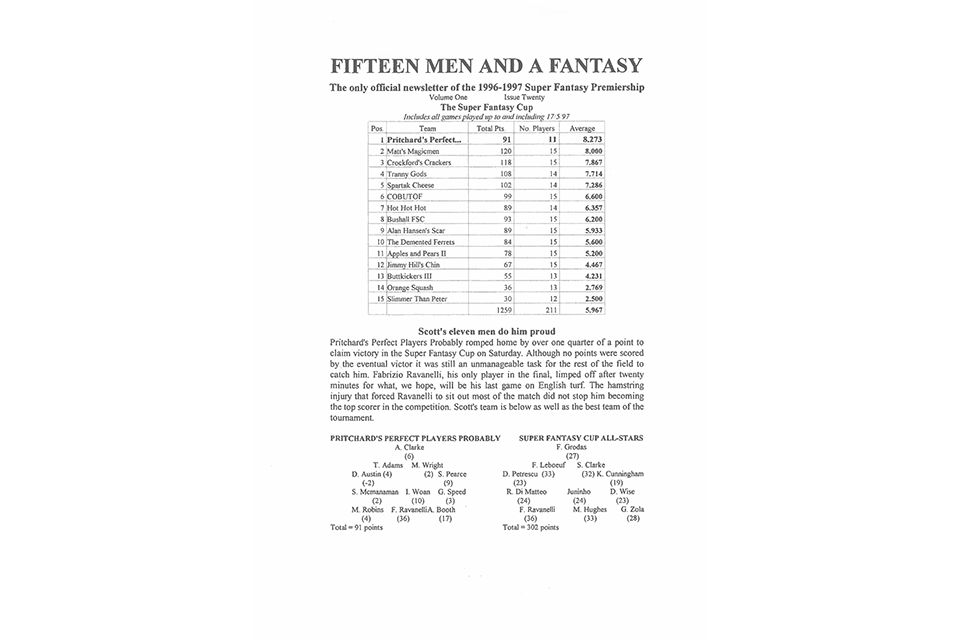 In the 1996/97 season the league was supported by a weekly (when possible) newsletter produced by Ross Peggs. Fifteen Men & A Fantasy would turn up on a Friday night at Scouts updating all managers on the latest league positions, cup information and transfer activity. Ross would also go the extra mile with interviews, stats and facts. To view these newsletters, click on the link above to open a PDF.