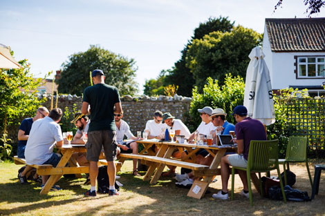 After breakfast, eleven became twelve as manager Peggs joined the rest at Norwich train station, and all boarded the 1045 to Sheringham. A little under an hour later they all departed the train at West Runton and headed to The Village Inn.